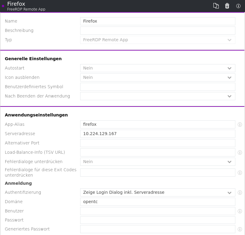 Im Openthinclient Manager legen sie für jede App eine Applikation vom Typ FreeRDP Remote App an. Dort pflegen sie die Login-Informationen sowie die Serveradresse. In den App-Alias tragen sie den Alias aus dem Server-Manager ein.
